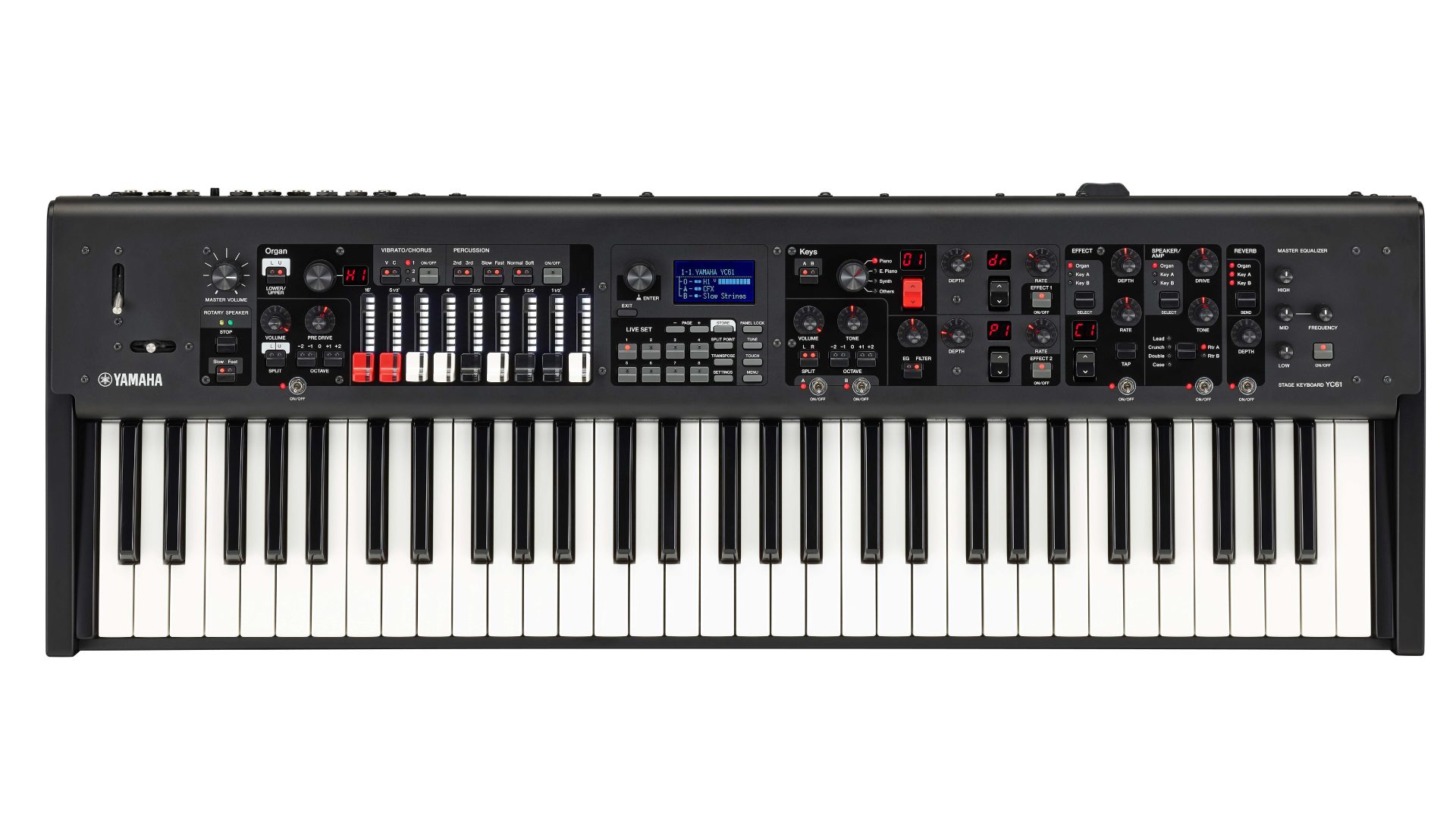 The authentic Waterfall keyboard action of the YC61 was created by painstaking research into traditional organ keyboards and constant feedback from top keyboard artists. The result is a keyboard that not only provides the distinctive touch of an organ, it gives artists new ways to express themselves on acoustic and electric pianos, synth leads, brass sections and more.